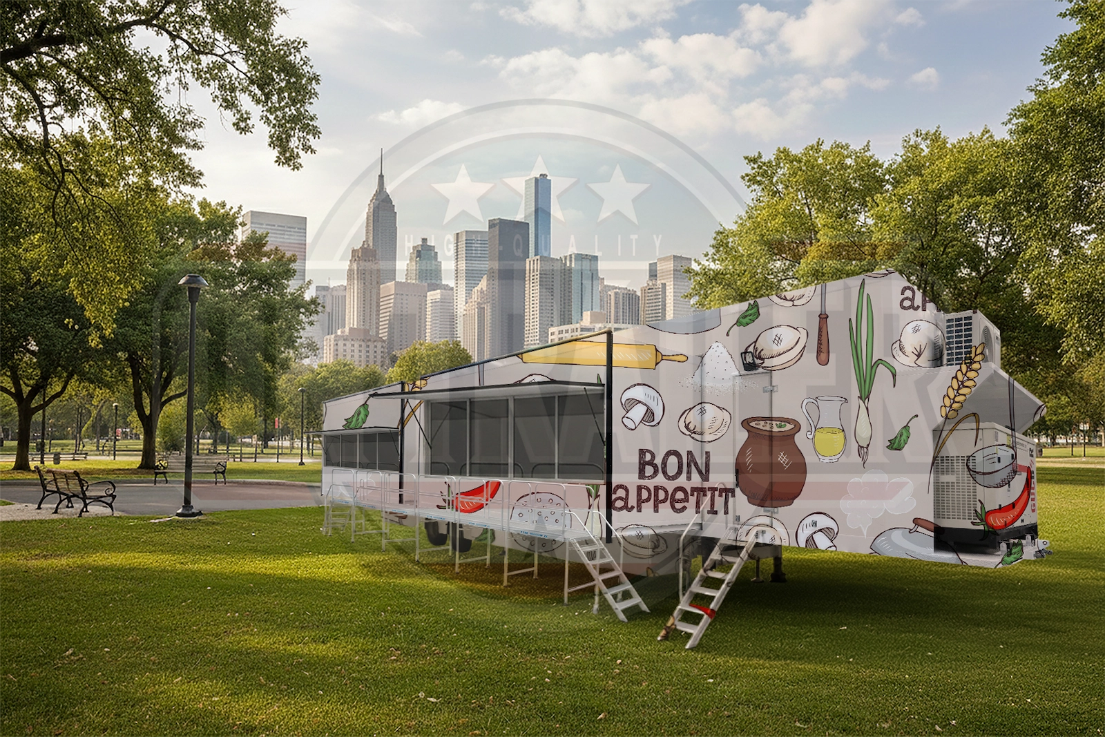 İçerisinde sanayi tipi davlumbazlar, trifaze elektrik panosu ve şasi altına gizlenmiş temiz/atık su tankları (paslanmaz) bulunur. LPG veya dizel yakıtlı pişirici sistemlerle otonom çalışabilir.